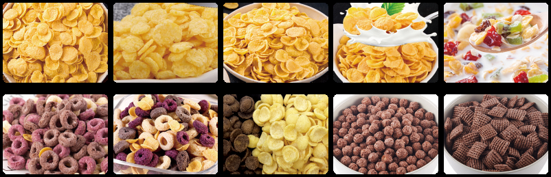 Breakfast cereal is one kind of crispy food, with the advantages of hard to be steeped broken and strong grain taste. It is the crispy flake which is made from corn meal and the other grains powder. The production line includes mixing, extruding, flaking, drying, high temperature baking, flavoring and cooling. It can be eaten like snack, and be eaten with milk or coffee as well. By changing moulds and production process, this production line can make different shapes of puffed food. Such as ring, ball, flake, star, letter etc.