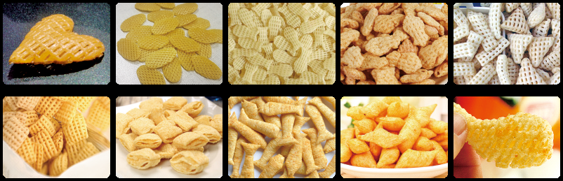 The production line uses wheat flour, corn flour, corn starch, tapioca starch, potato starch as raw material. By cooking, cutting etc process to produce spiral, tube, onion ring, waved chips etc snack pellet. Also can equip with pattern pressing machine and compound machine to produce bugles, net crispy, pani puri etc 3D snack pellet. Then by drying, frying and flavoring, the snack pellet can be made to be crispy, vivid instant-eat twice extrusion puffed food. Combinations of unit screw and precise control of processing, that achieve higher quality and various products with more chosen for raw material.