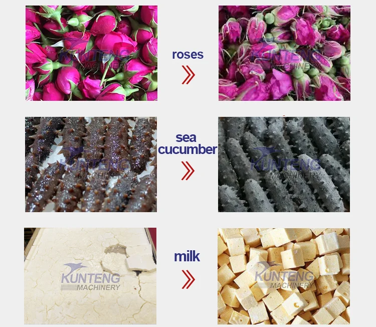 Freeze drying machine is vacuum freeze-drying, the material moisture in the vacuum condition, directly sublimed into gas, maintain the original color, shape, nutrition, with good rehydration and good taste, is today's very popular freeze-dried snack food processing equipment,also widely used in various chemical and biological freeze-drying industries.