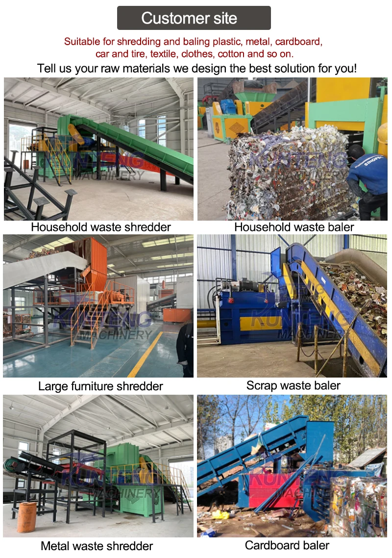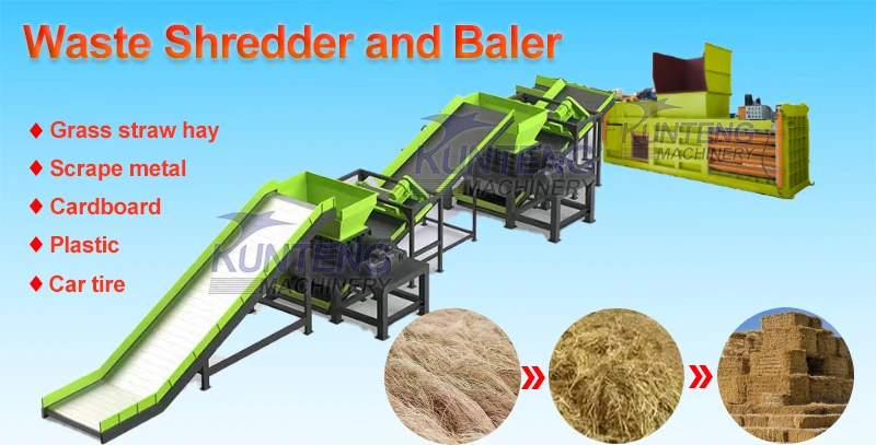 Our waste shredder and baler suitable for various materials, such as grass, straw, hay, fabric, textile, plastic waste barrels, glass, foam, scrap iron waste, waste wood, waste cardboard, waste bottles, waste cans, waste tires.etc.