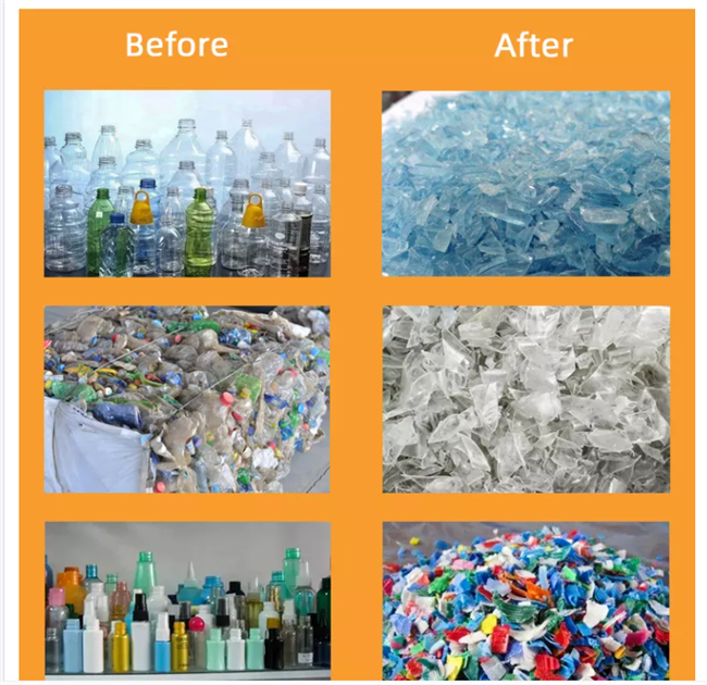 The waste dirty material go through delabelling, crushing, washing, drying, and collecting process will turn to be clean flakes for reuse.