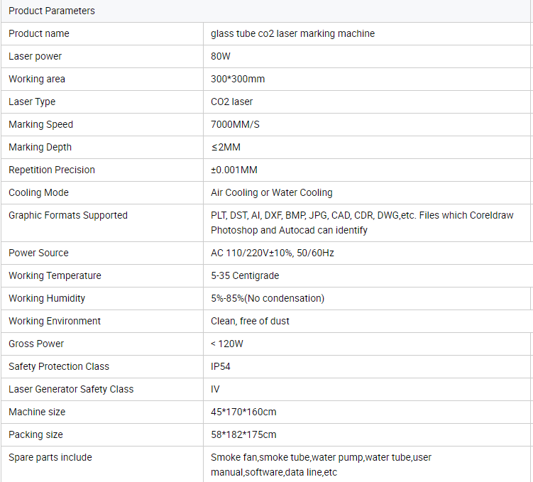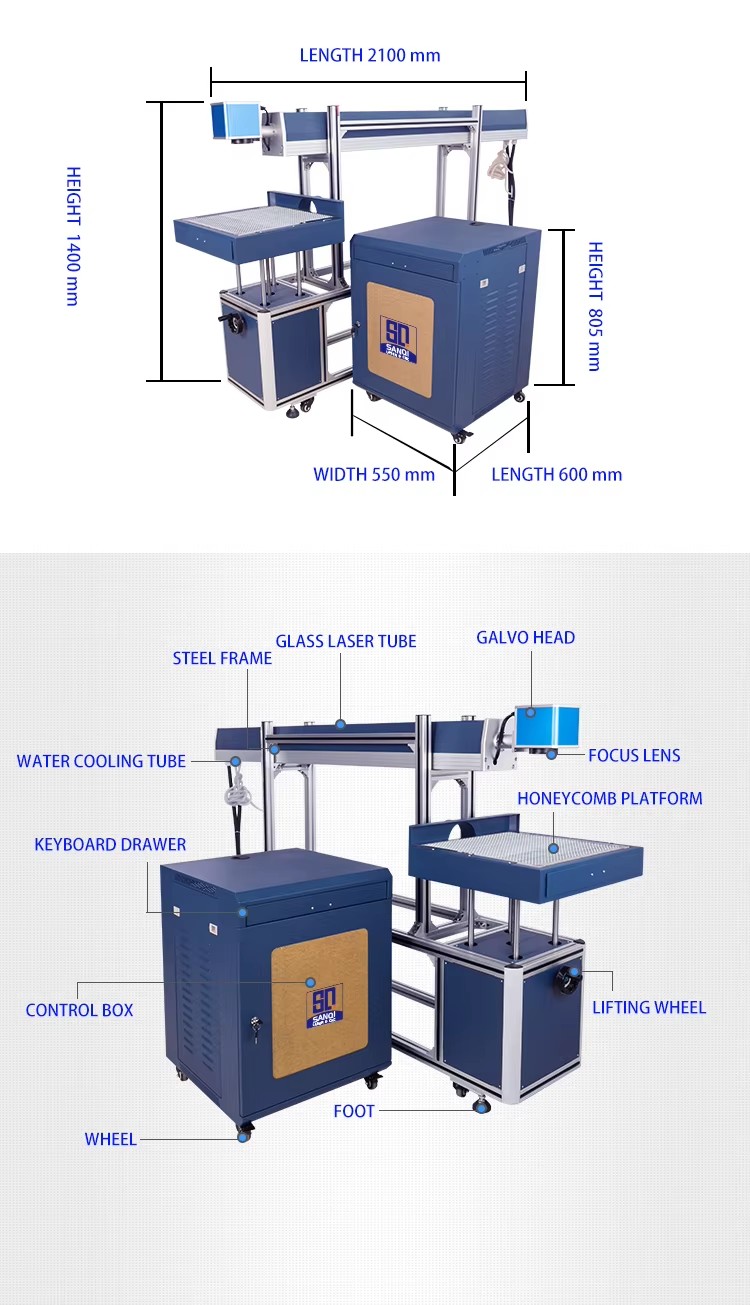 CO2 carbon dioxide glass tube laser marking machine uses laser beam to mark permanently on the surface of various substances. The effect of marking is to expose the deep substance through the evaporation of the surface material, so as to engrave exquisite patterns, trademarks, dates, LOGO or text. At present, CO2 laser marking machine / RF marking machine is mainly used for some finer and more precise requirements High occasions. Used in food, medicine, wine, electronic components, integrated circuits (IC), electrical appliances, mobile phone communications, building materials, PVC pipes and other industries, the main advantages of CO2 laser marking machines and inkjet printers are no consumables and permanent.